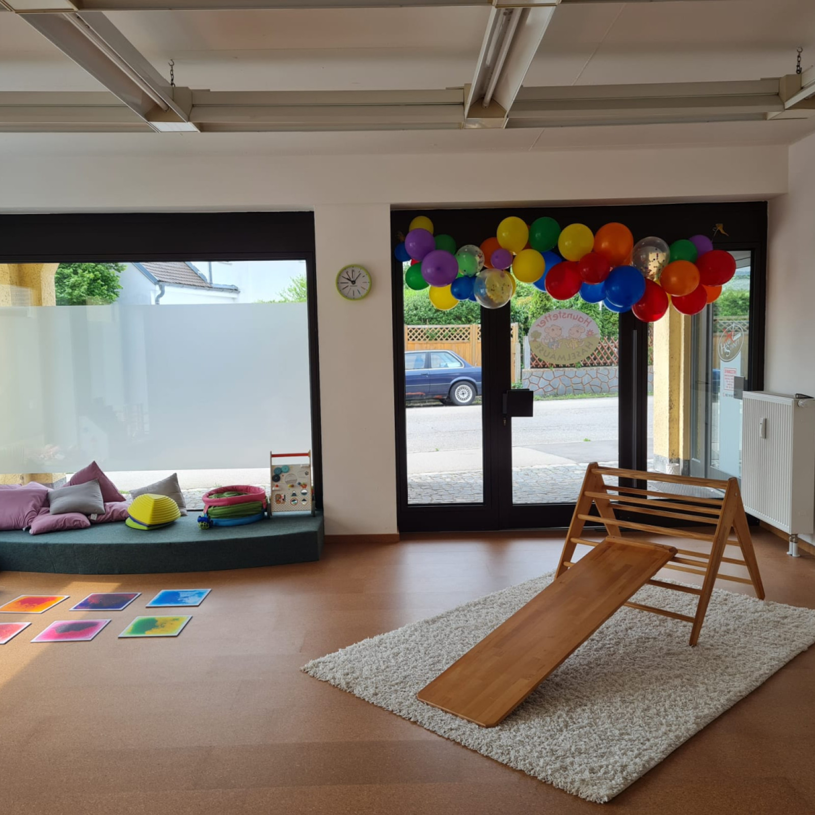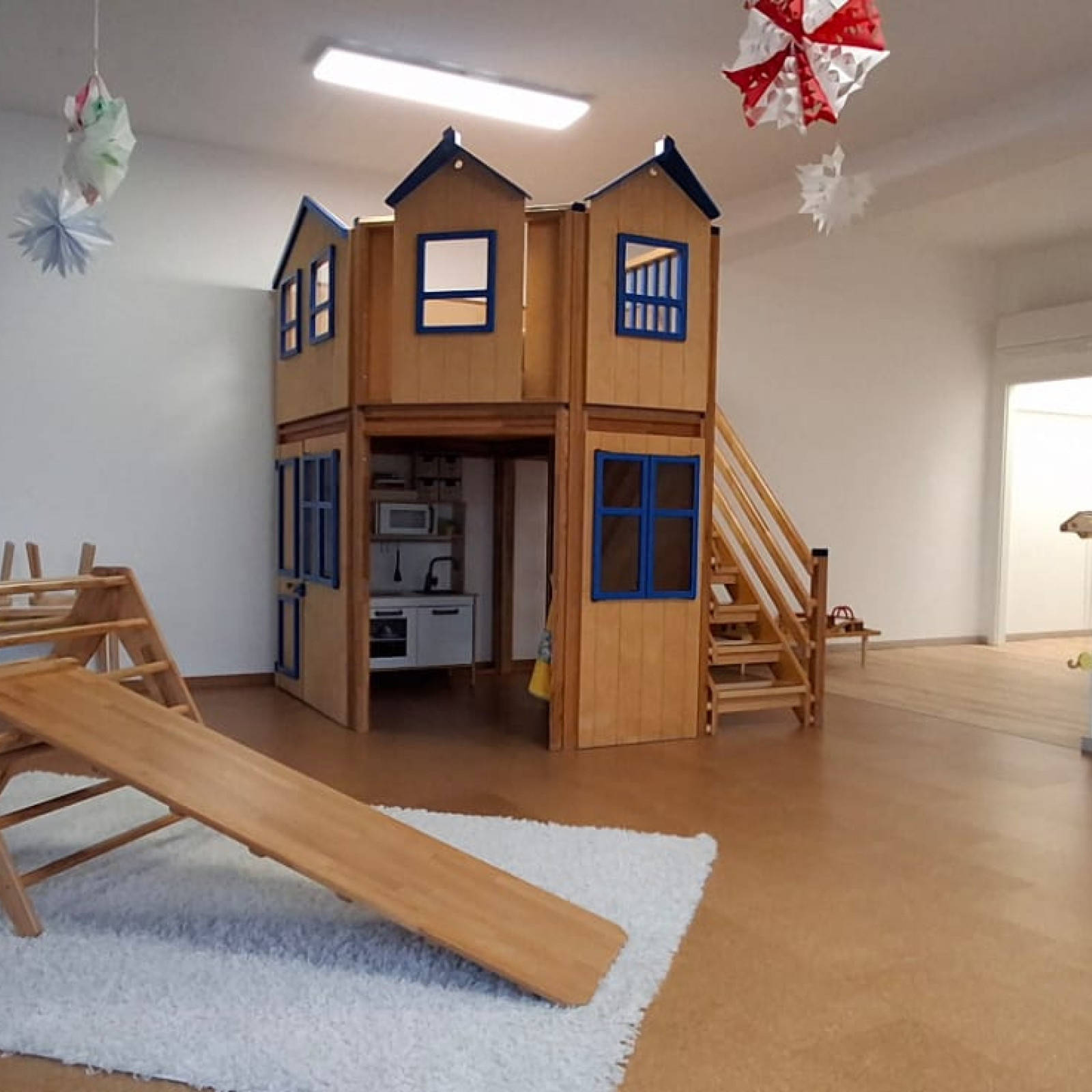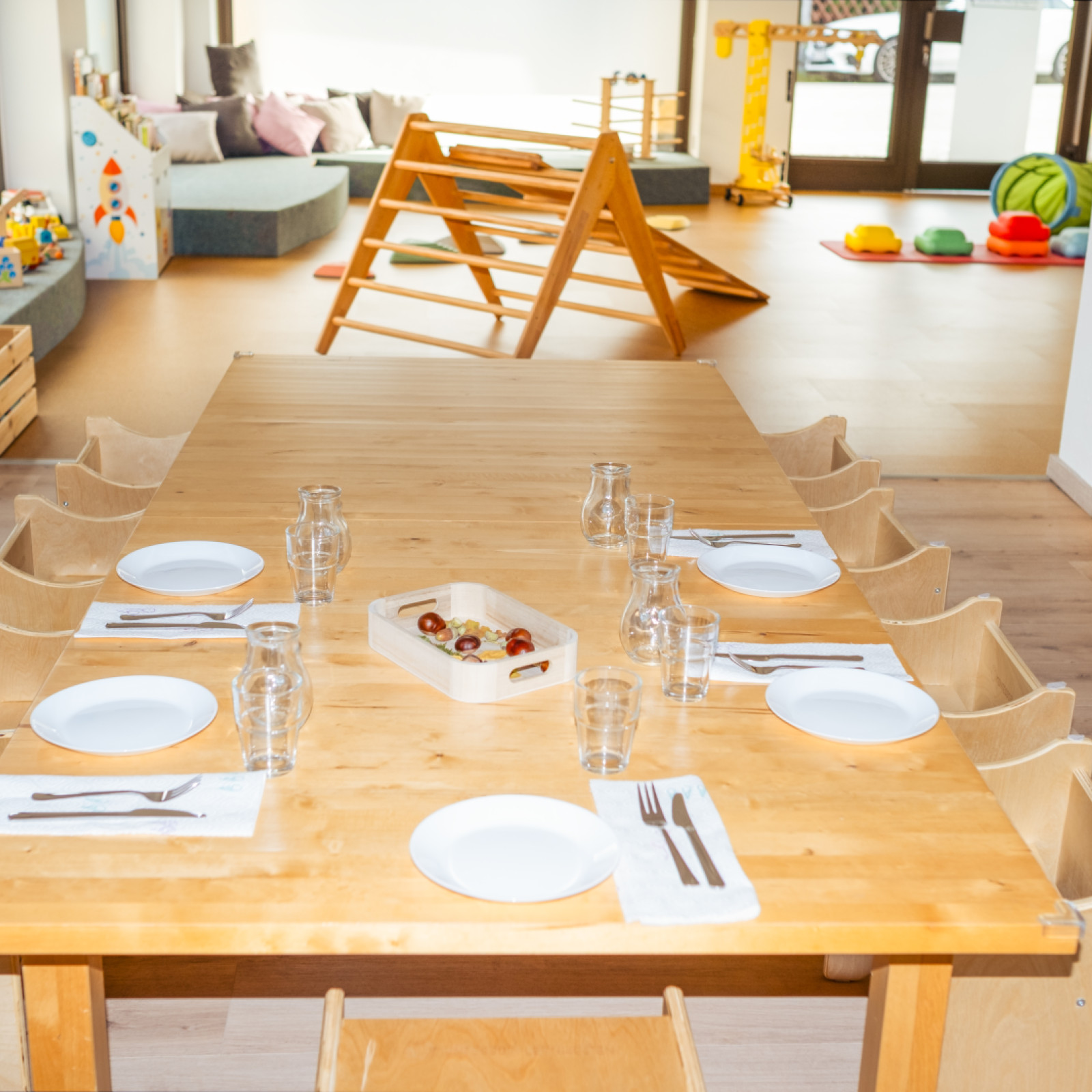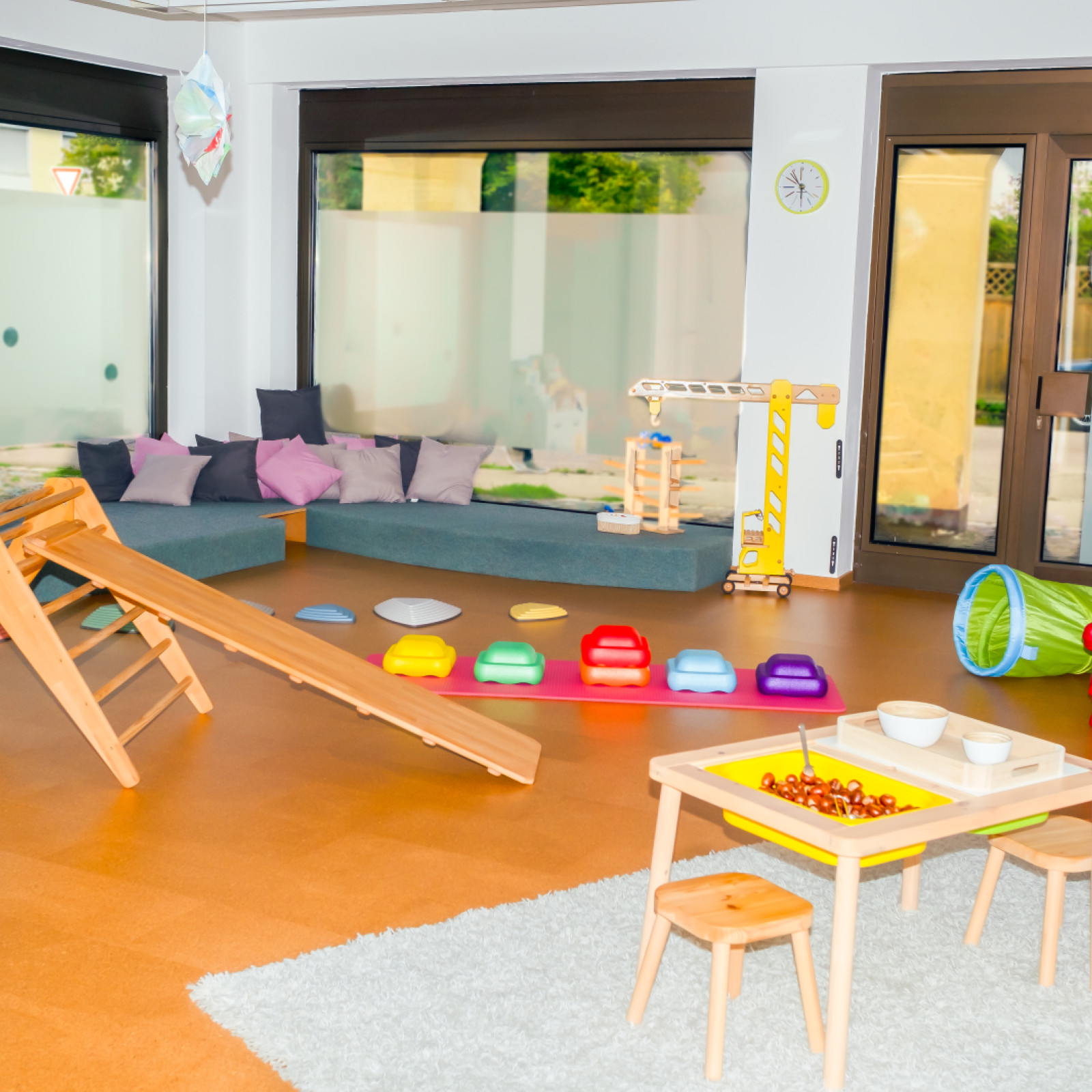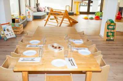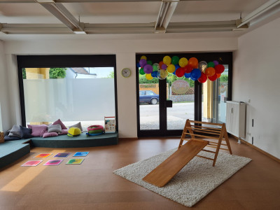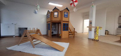 Neben den klassischen Spielsachen wie Autos, Puzzles, Puppen, Holzeisenbahn und Bausteinen gibt es eine Leseecke bzw. Kuschelecke mit großen Kissen, um eine gemütliche Atmosphäre und einen Rückzugsort zu schaffen. Zusätzlich gibt es einen Bewegungsbereich mit Pikler-Dreieck, Balanciersteinen und weichen Turnmatten. Auch stellen wir den Kindern unterschiedliche Materialien bereit, wie z.B. Knete, Naturmaterialien am Sinnestisch und Bastelmaterial um neue Sinneseindrücke zu sammeln. Die Kinderküche und die Verkleidungskiste regen zu Rollenspielen an. Während der Mittagszeit verwandelt sich die Kuschelecke mit Kindermatratzen in eine gemütliche Schlaflandschaft, wo die Kinder schlafen oder nach Bedarf nur ruhen können. Im offen gestalteten Betreuungsraum steht auch ein großer Tisch mit Stühlen für die Mahlzeiten zur Verfügung. Dort können während der Essenszeit alle gemeinsam am Tisch sitzen und jedes Kind erhält einen altersentsprechenden Stuhl. In der Küche wird nach Wunsch gemeinsam mit den Kindern das Essen zubereitet.